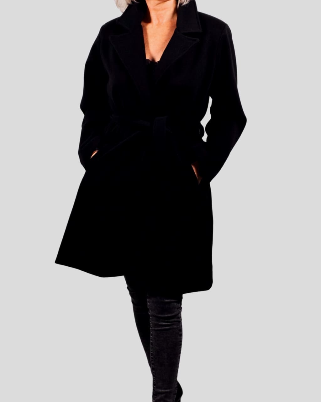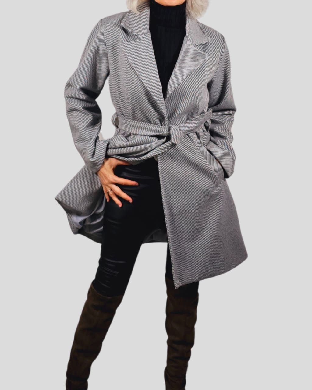 Abrigo tres cuartos con ribete y cinturón, en color gris y negro. Composición: 95% Poliéster, 5% Elástico.