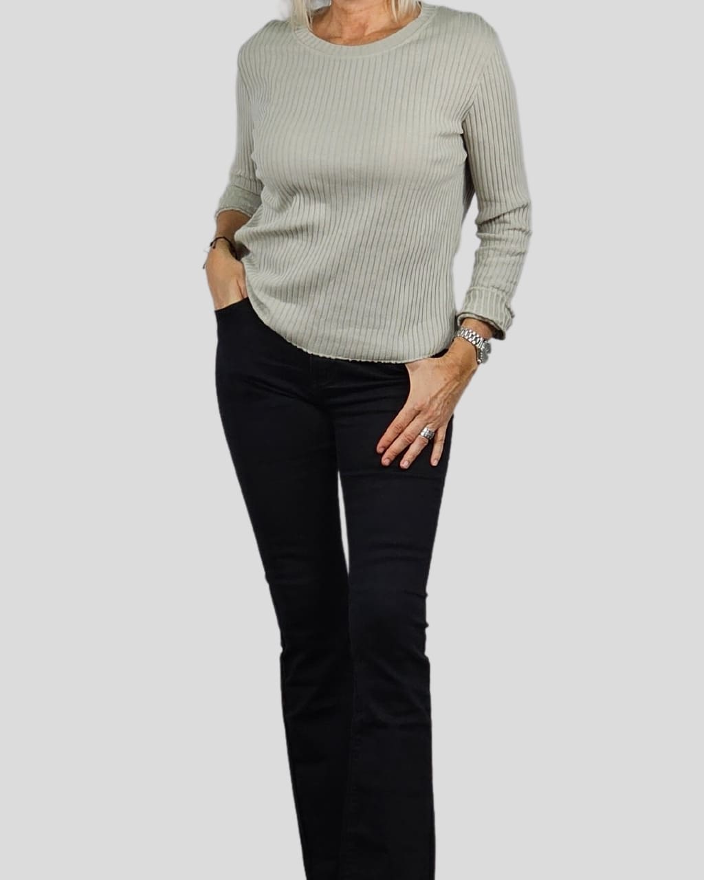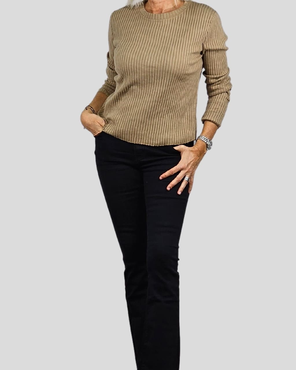 Camiseta de canalé de cuello redondo, manga larga, en color crudo y camel. Composición: 80% Algodón, 20% Poliéster.