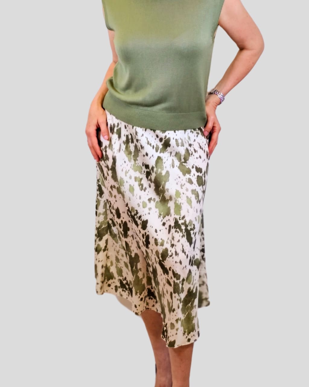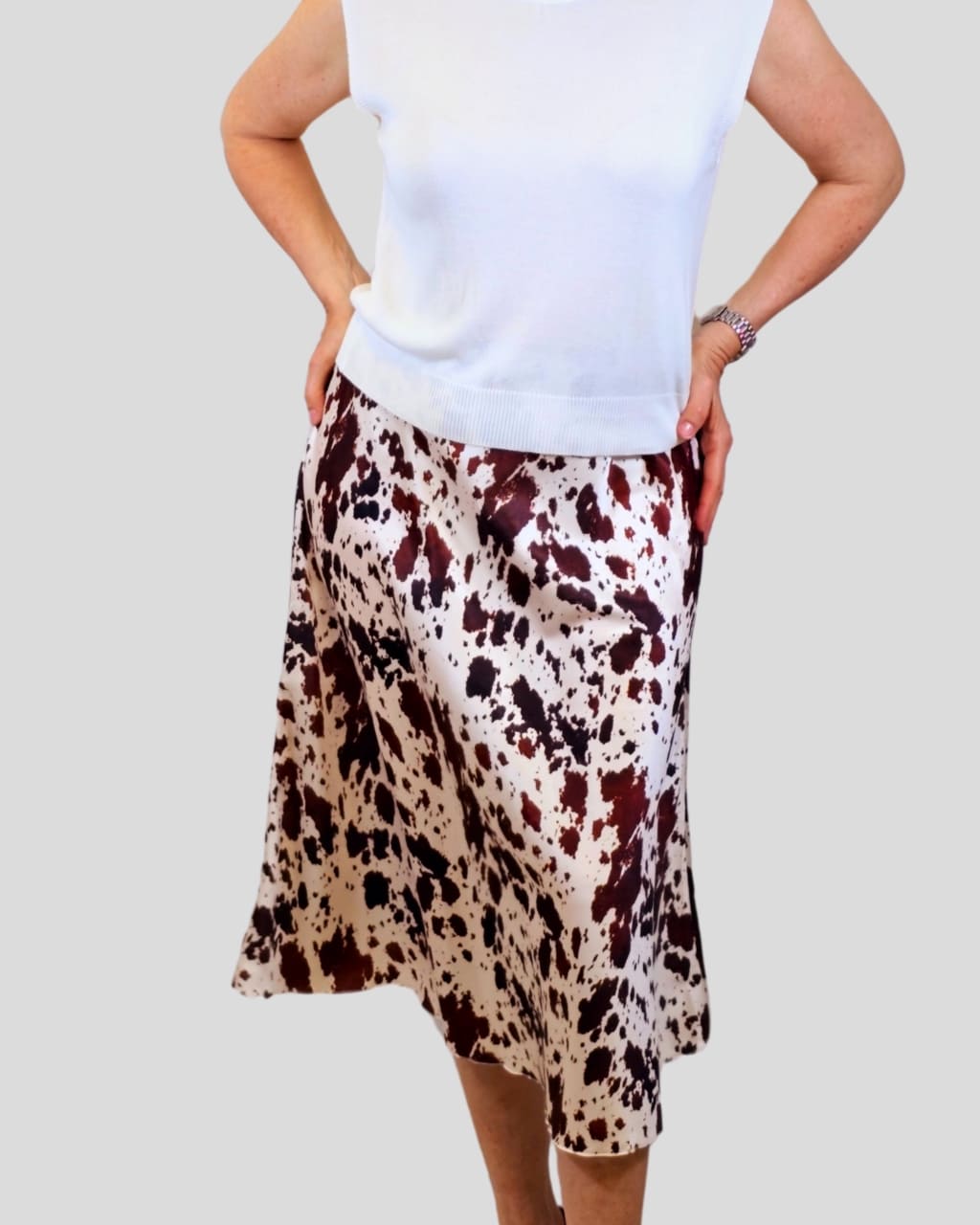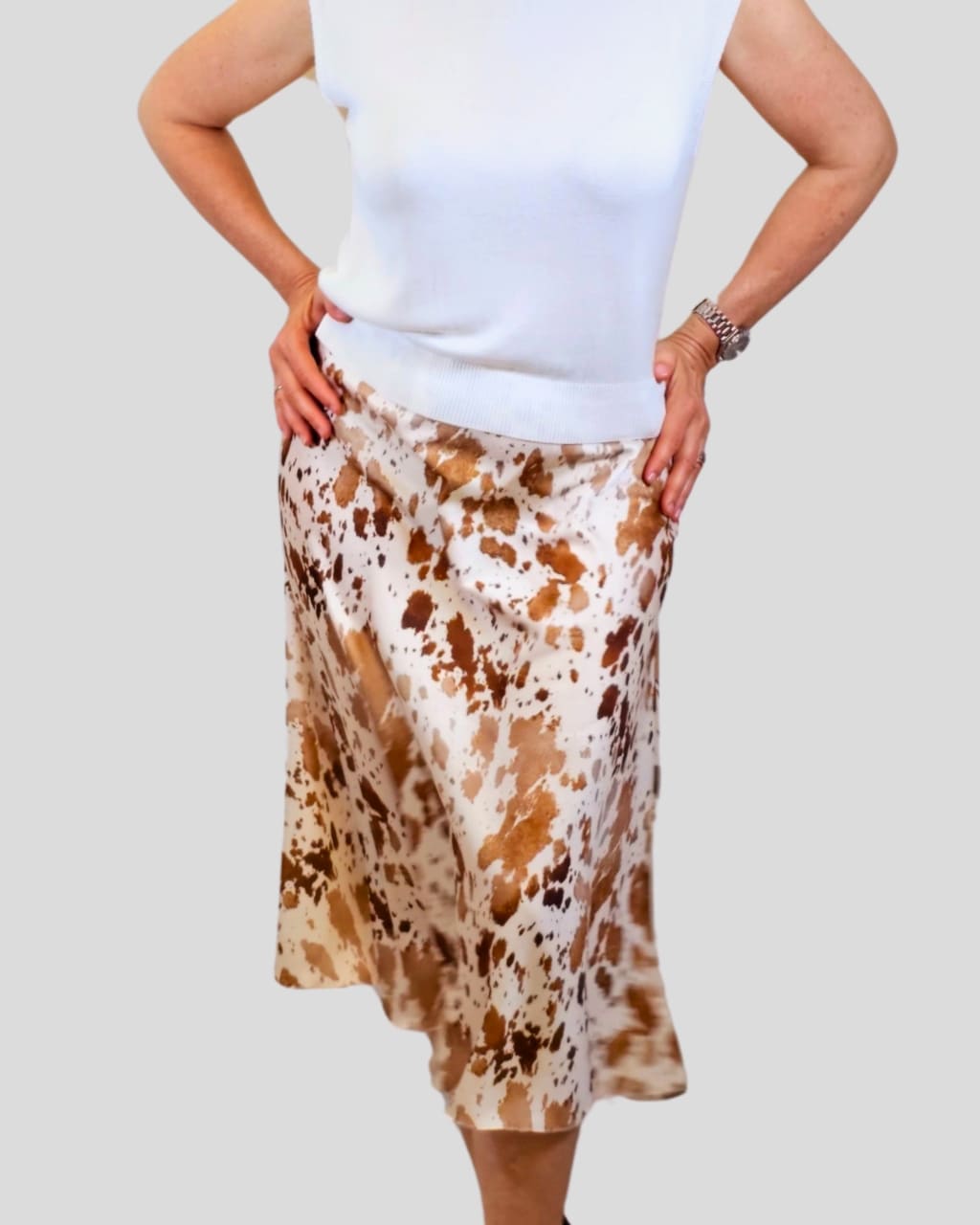 Falda midi de satén, en estampada de vaca, en color camel, verde y marrón oscuro, Composición: 100% Poliéster.