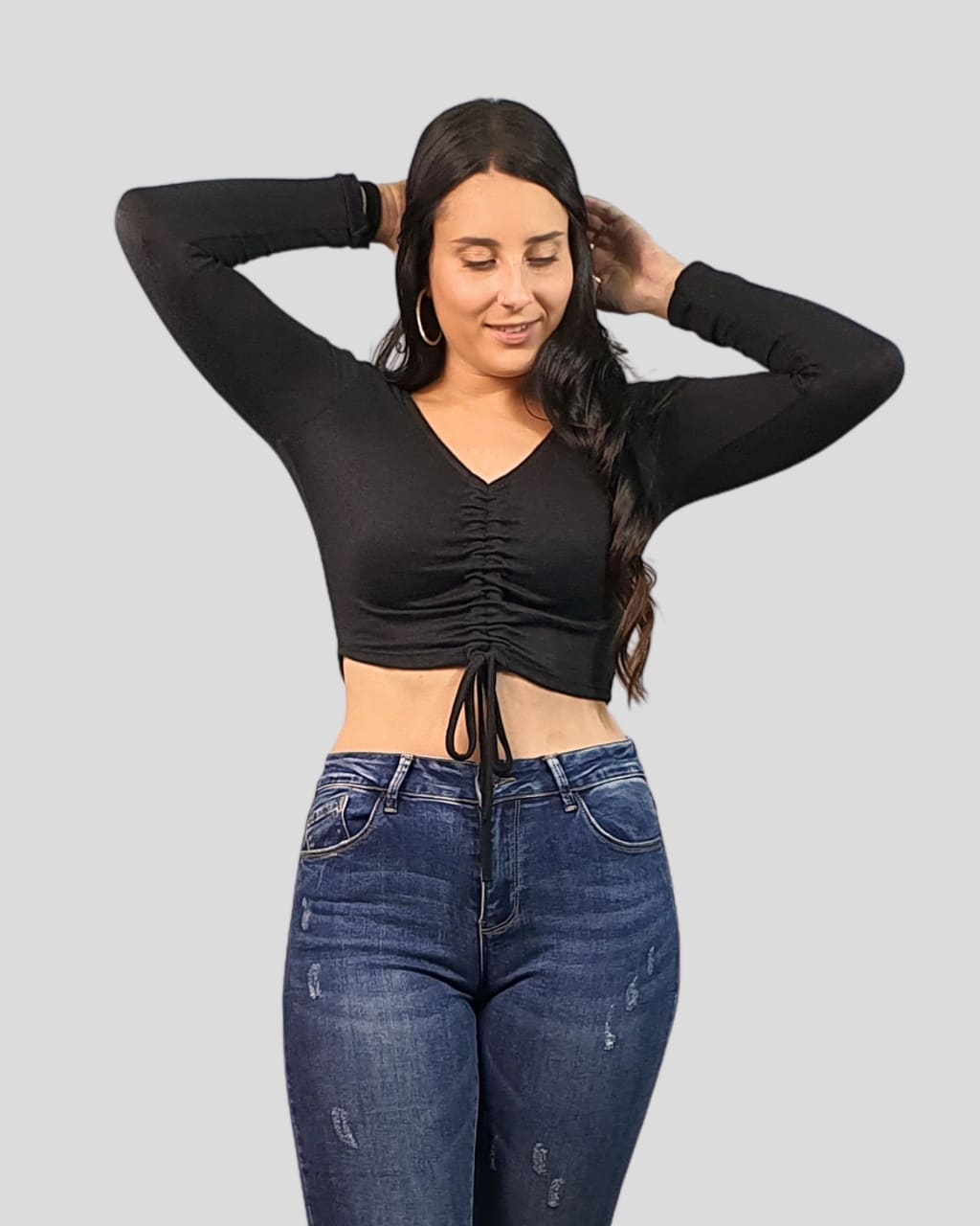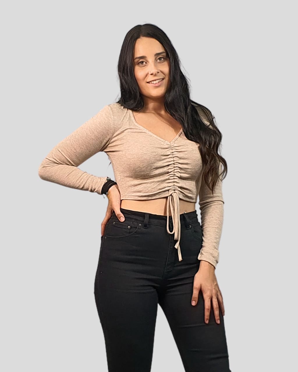 Jersey fino cozy fruncido frontal de manga larga, en color beige y negro. Composición: 50% Viscosa, 25% Poliéster, 25% Nylon.