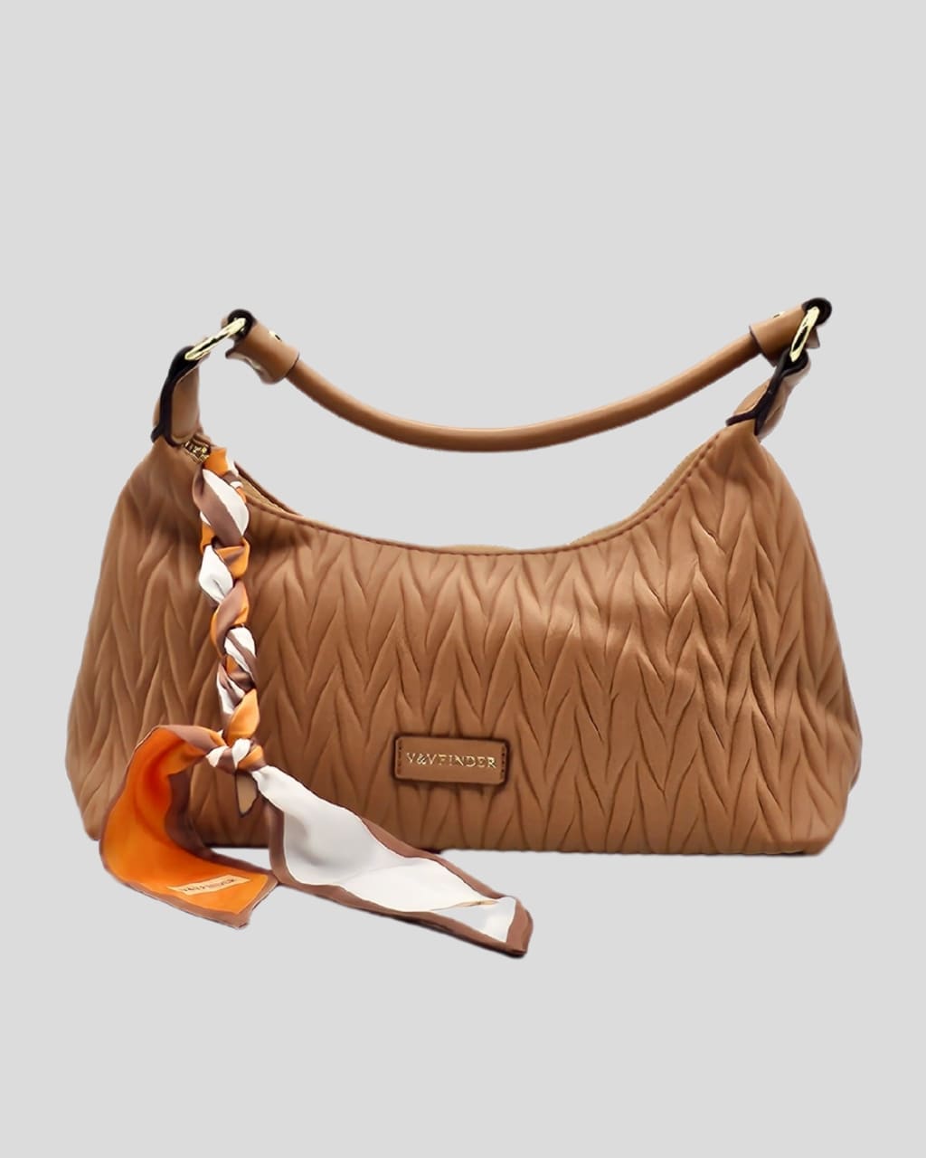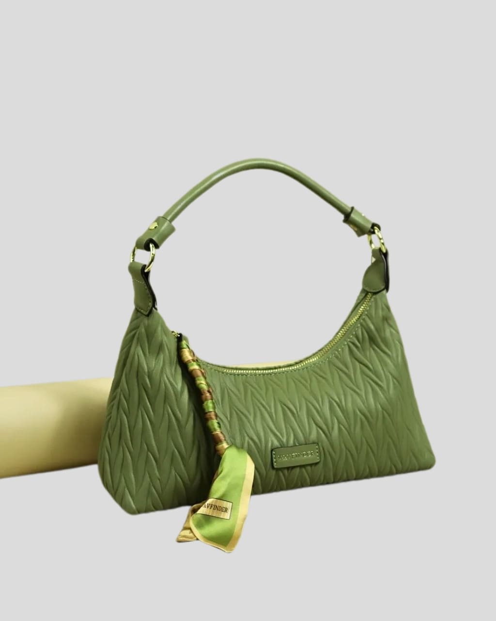 Descubre el bolso bandolera pequeño en forma de media luna en color camel, verde y negro. Composición: 100% PU.