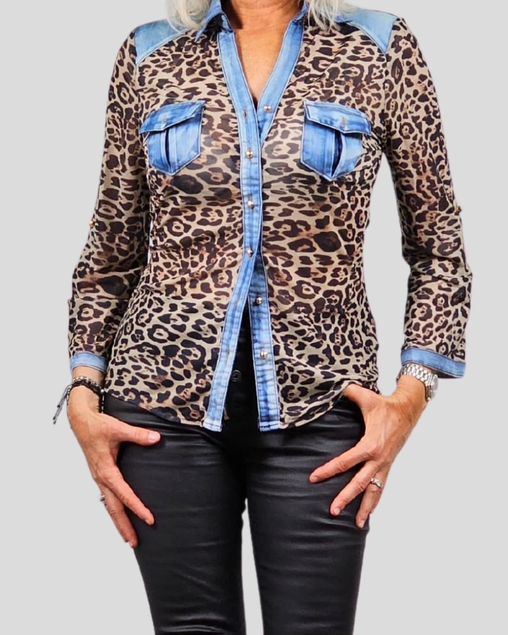 Camisa de manga larga transparente, estampada en animal print, en color celeste/marrón. Composición: 95 % Poliéster, 5% Elástico.