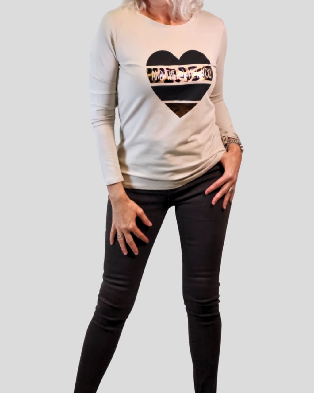 Añade un toque de encanto y audacia a tu vestuario con nuestra camiseta corazón animal print. Esta prenda de diseño sencillo pero impactante es perfecta para el día a día. una combinación de tonos blanco, beige y marrón oscuro— que contrasta de manera elegante sobre la base de la camiseta en color blanco liso. Es una fusión ideal entre la dulzura del símbolo del corazón y la fuerza del estampado de tendencia.