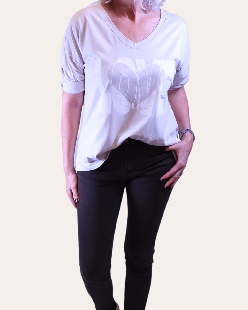 Dale un toque romántico y positivo a tu día a día con nuestra camiseta manga larga love. Esta prenda básica se renueva con un precioso estampado central que aporta personalidad sin perder la sencillez. Su favorecedor cuello de pico estiliza el escote, convirtiéndola en una opción ideal para llevar sola o bajo una chaqueta.