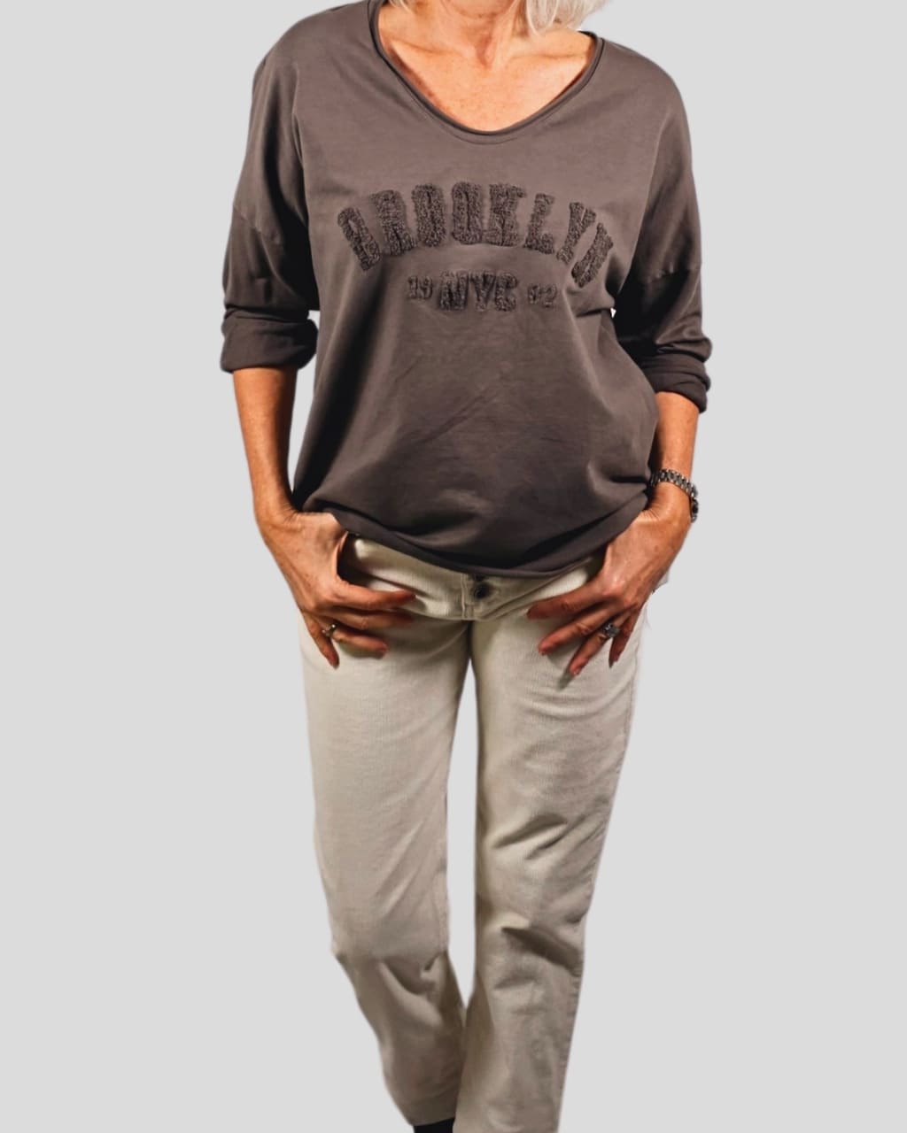 El protagonista es el estampado frontal, que luce el nombre «Brooklyn NYC» con un estilo audaz y urbano. Este diseño rinde homenaje al distrito más cool de la Gran Manzana, añadiendo un toque cosmopolita a tu vestuario casual. Es la pieza perfecta para quienes buscan inyectar personalidad en sus looks diarios.