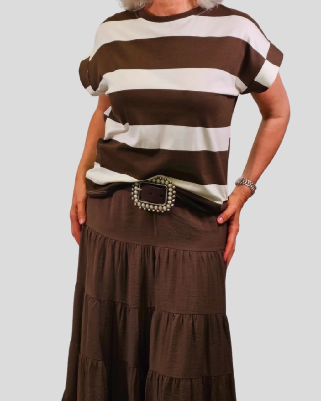 Camiseta de manga corta a rayas anchas y cuello redondo, en color blanco-marrón. Composición: 95% Algodón, 5% Elástico.