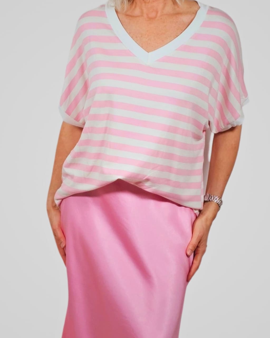 Camiseta de rayas ancha con cuello pico y manga corta, en color rosa y caqui. Composición: 95% Viscosa, 5%Elástico.