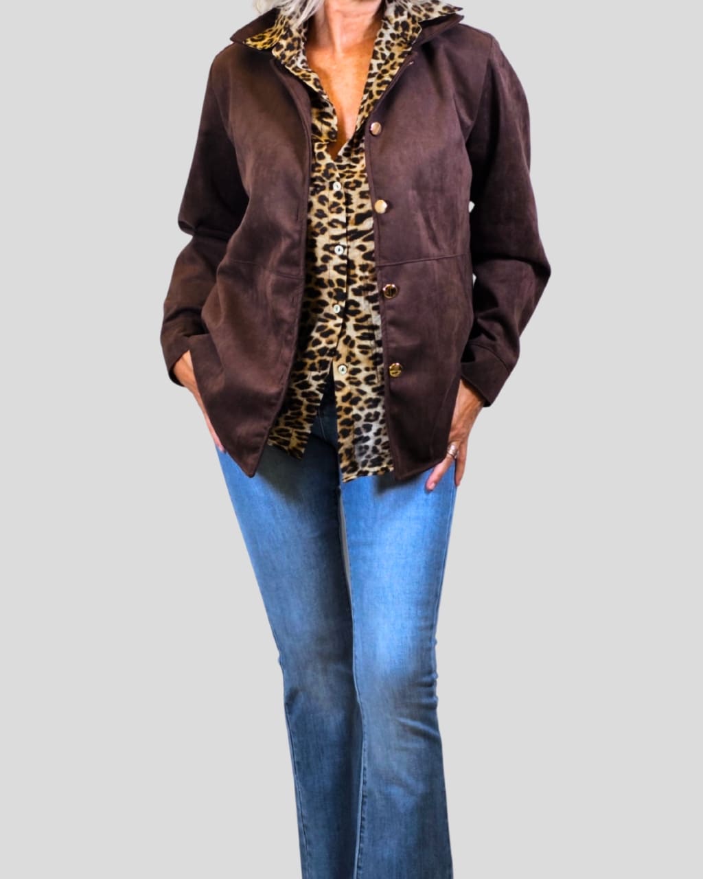 Chaqueta antelina botones dorados, perfecta como sobre camisa o para llevarla cerrada como una blusa. Disponible en dos elegantes colores: crudo y marrón oscuro. Los detalles de botones dorados añaden un toque de brillo y distinción, destacando sobre el tejido y convirtiendo esta chaqueta en el centro de todas las miradas.