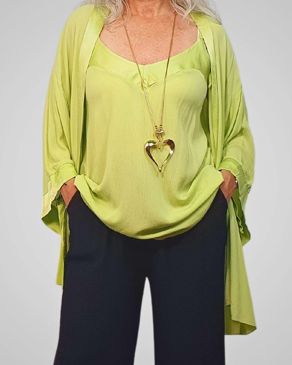 El detalle clave es su ribete satinado en contraste, que aporta un toque de brillo y distinción. La combinación de colores en crudo y verde lima es moderna y versátil, permitiendo múltiples combinaciones en tu vestuario.