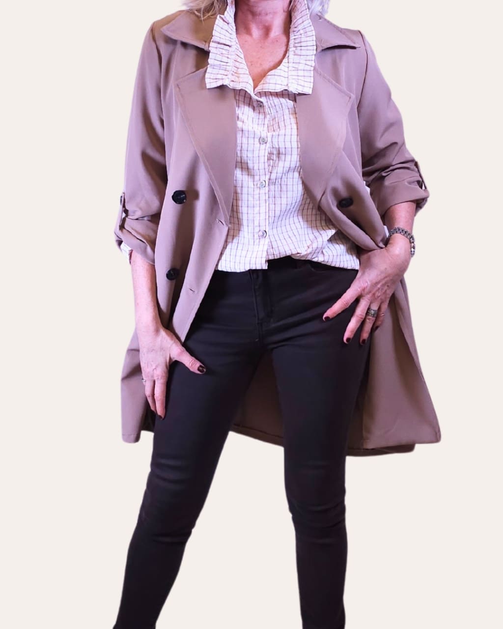 Esta gabardina fina fluida cinturón es el complemento perfecto para llevar sobre nuestra camisa cuadros cuello mao creando un contraste de texturas ideal.