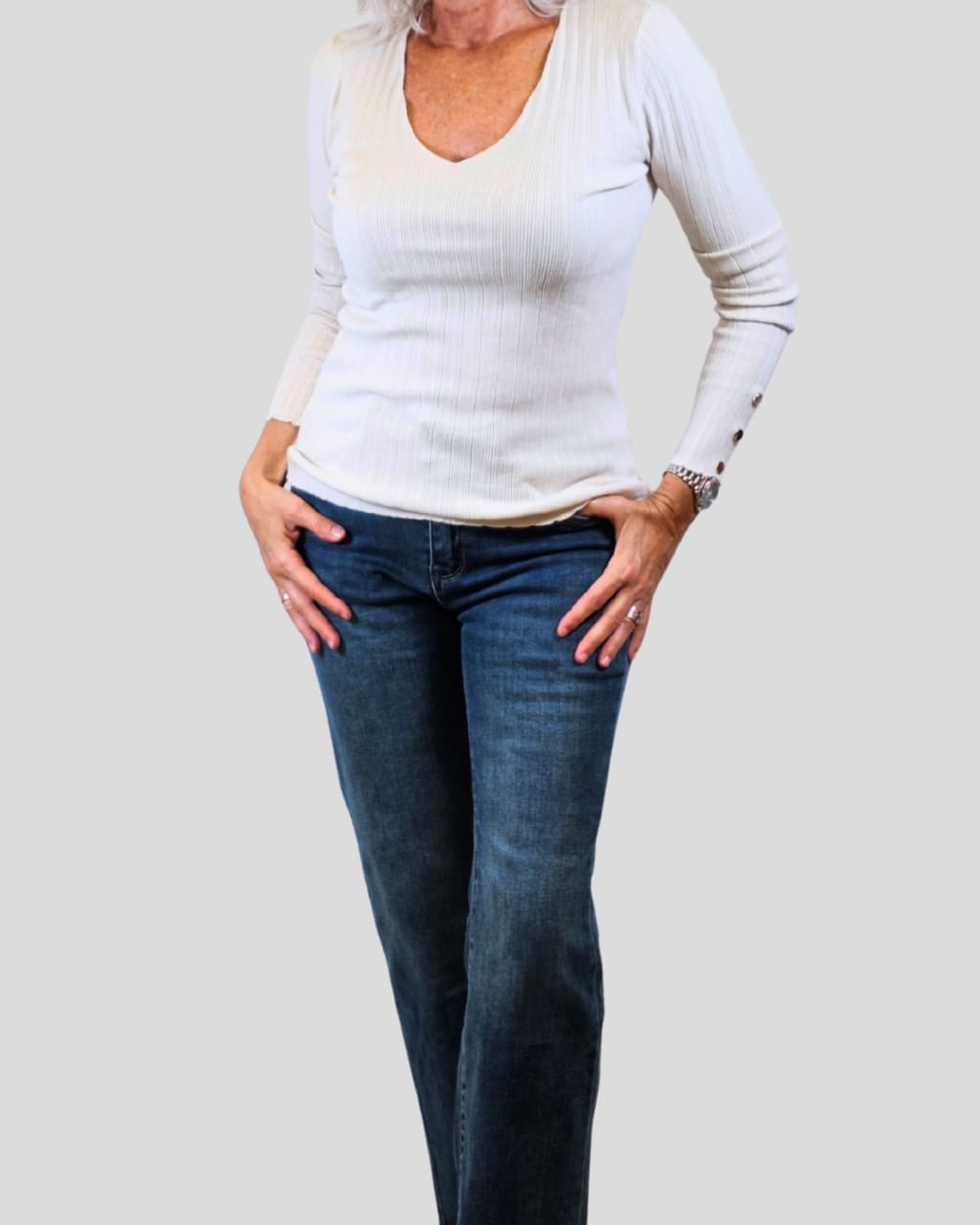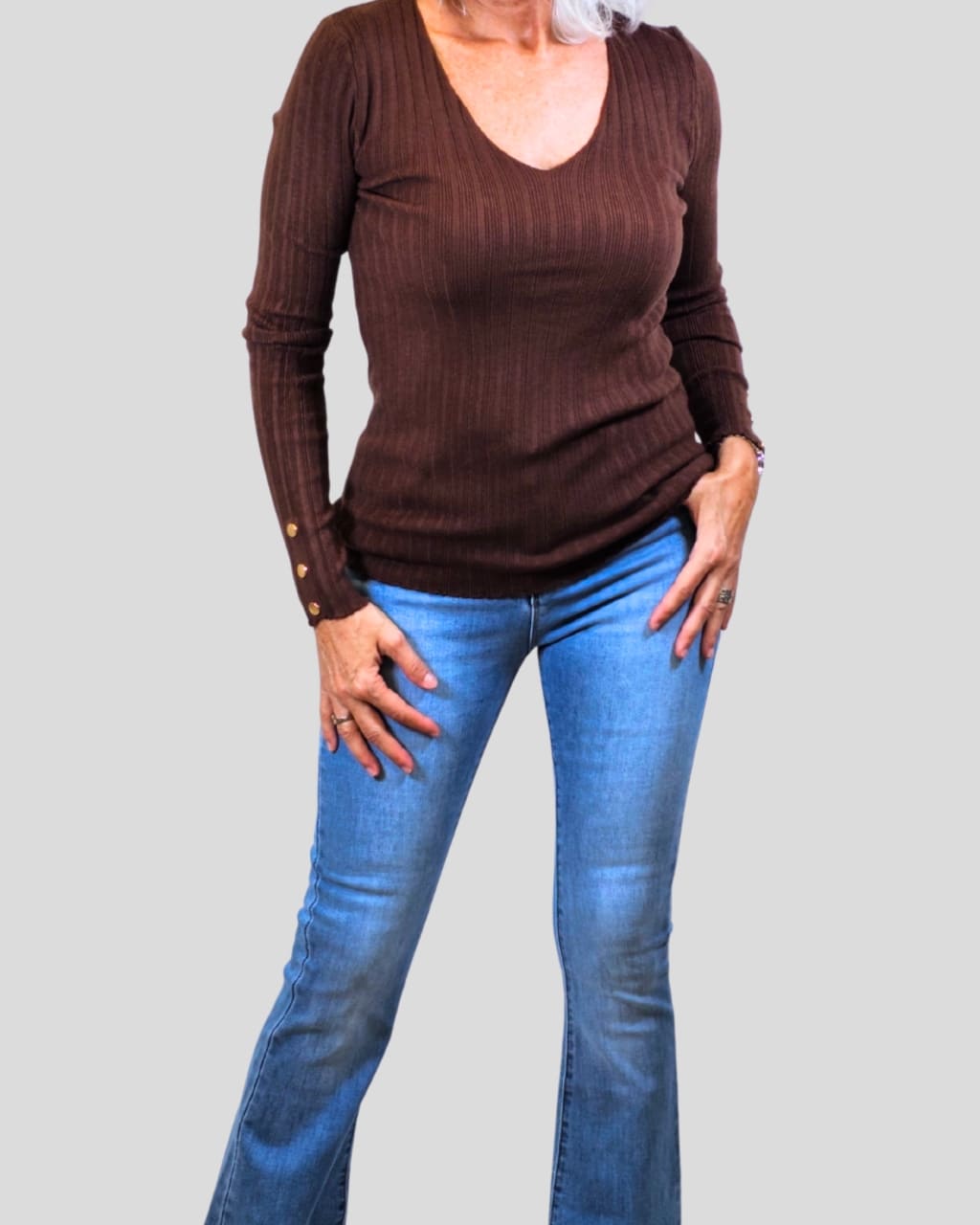 Descubre la elegancia y el confort de nuestro Jersey Canalé botones en puños. Confeccionado con un suave tejido de canalé, este jersey es una prenda atemporal que no puede faltar en tu armario. Los botones dorados en los puños, un detalle sutil pero sofisticado, añaden un toque de brillo que eleva cualquier look, de día o de noche. Su textura acanalada, además de ser muy agradable al tacto, crea una silueta estilizada y favorecedora.