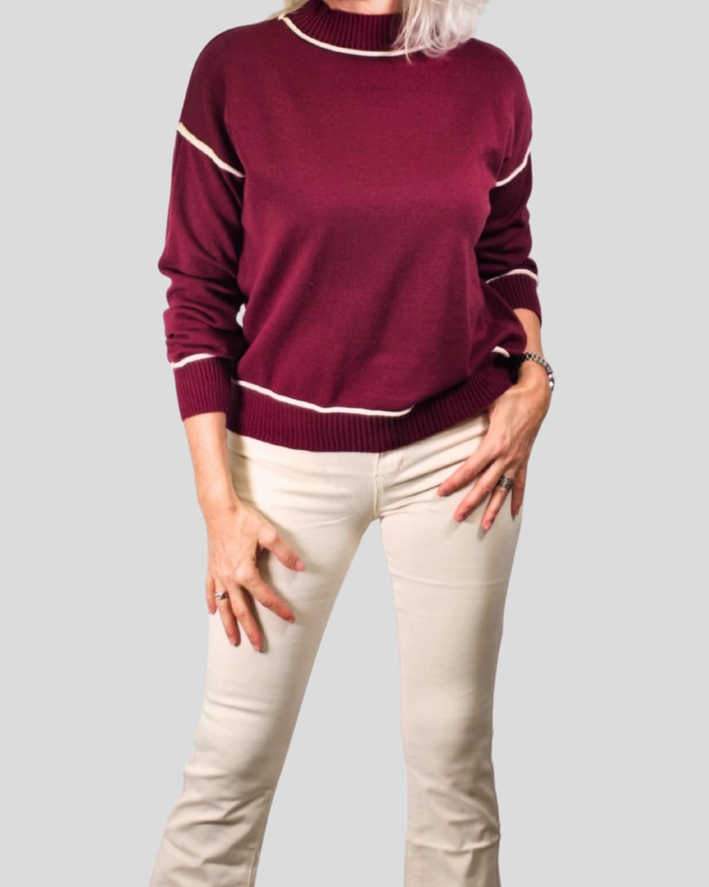 Disponible en los ricos tonos granate y marrón chocolate, este jersey es ideal para las estaciones frías. Su diseño versátil lo hace adecuado tanto para un look de oficina como para un plan de fin de semana.