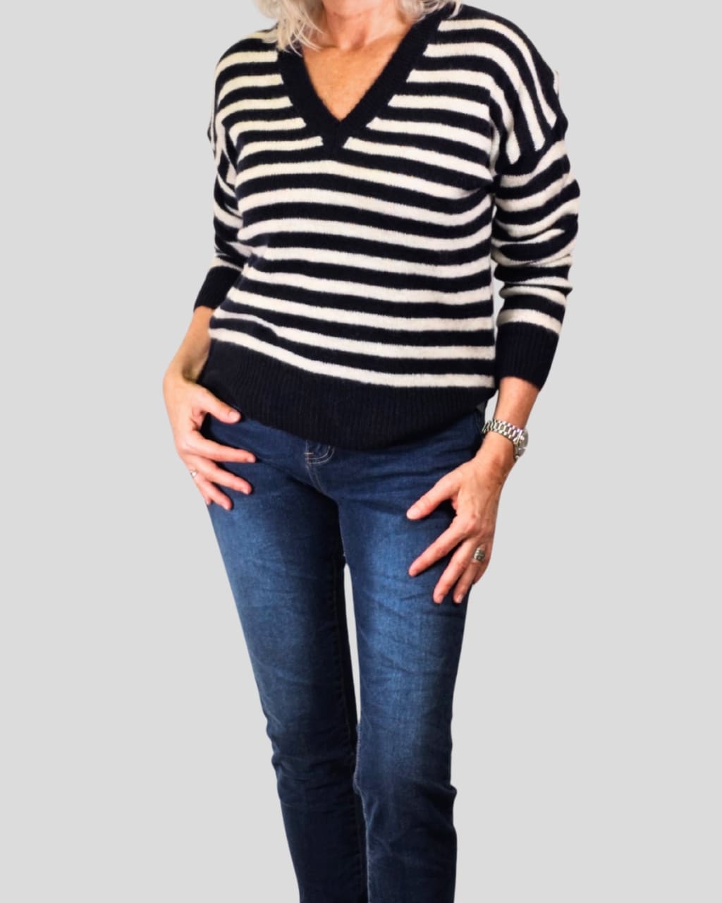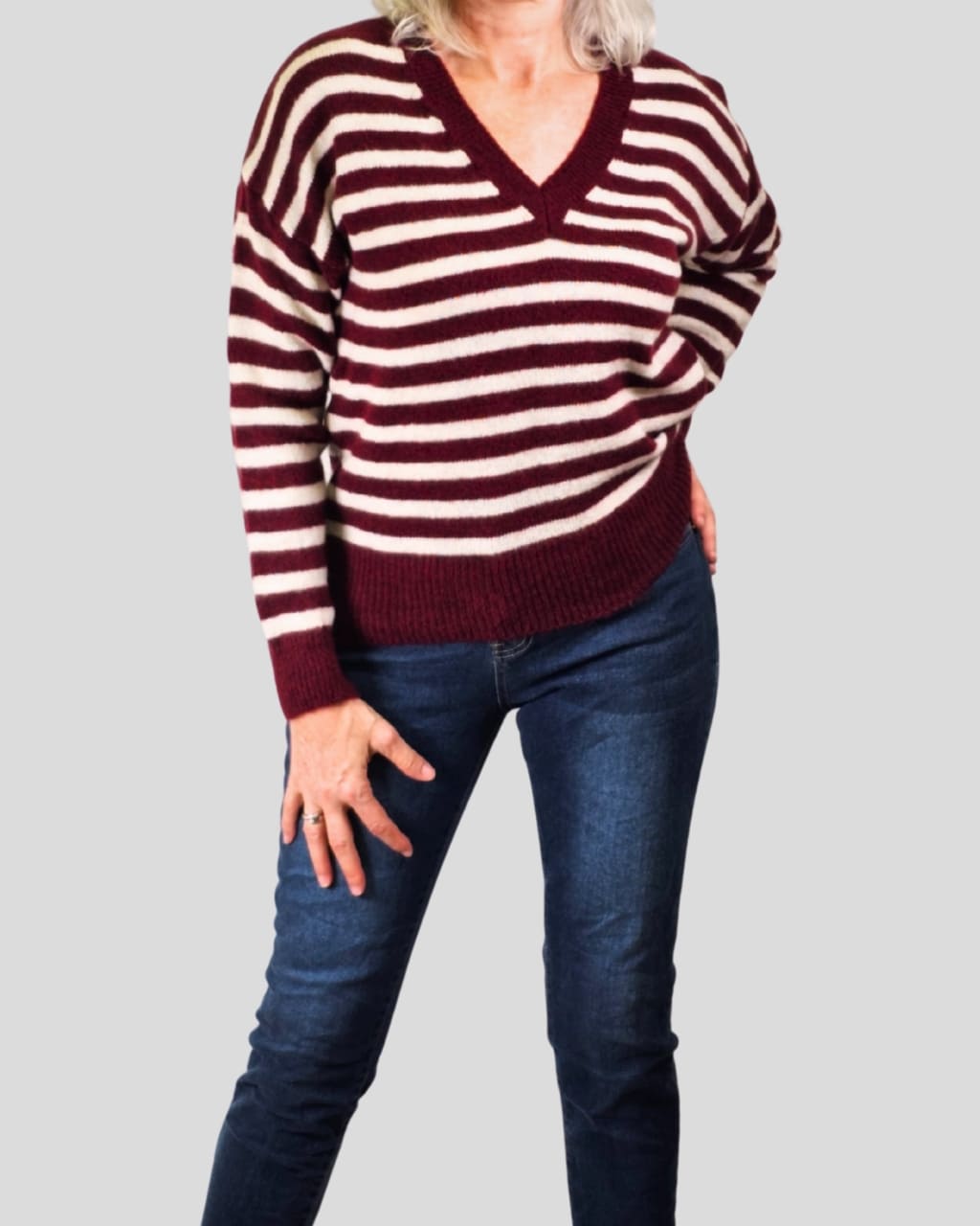 La composición del tejido garantiza una calidez superior y un tacto suave: contiene un 38% de lana, un 38% de acrílico (que le da ligereza y suavidad) y un 18% de poliéster. Esta mezcla hace que el Jersey de cuello pico con rayas sea confortable y resistente al desgaste.