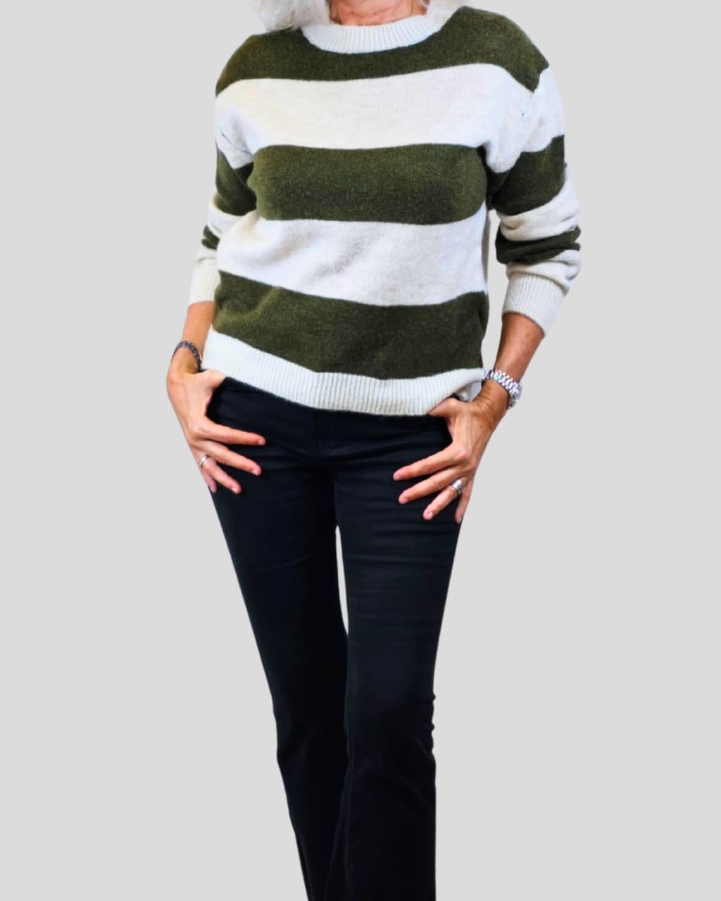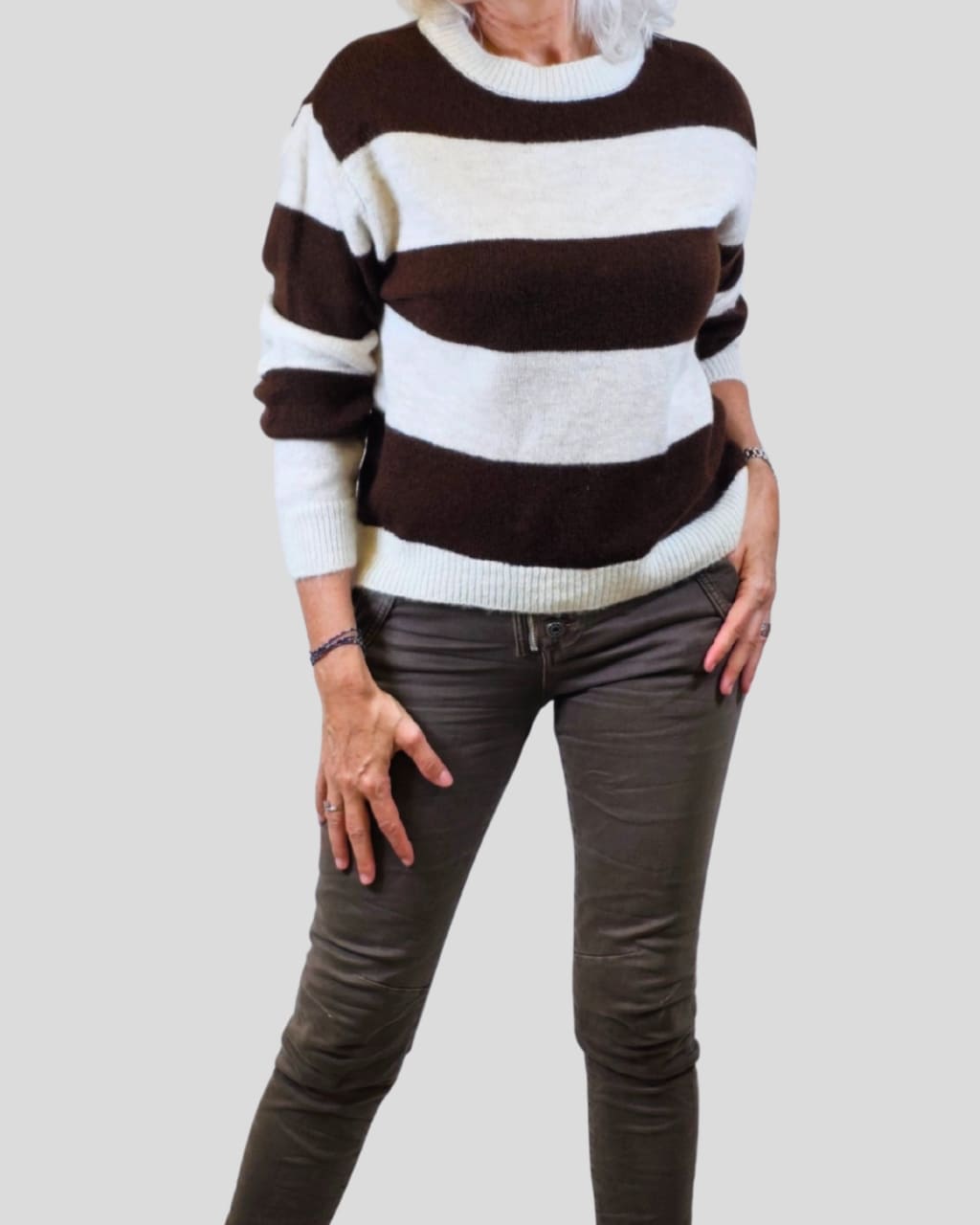 Jersey lana raya ancha y cuello redondo es la prenda ideal para quienes buscan una combinación perfecta entre estilo, comodidad y calidez. Su diseño atemporal, con las rayas en colores caqui y marrón oscuro, le da un toque distintivo y elegante, fácil de integrar en cualquier armario. Confeccionado con un 38% de lana, este jersey no solo te protegerá del frío, sino que también te proporcionará una sensación de suavidad y confort.