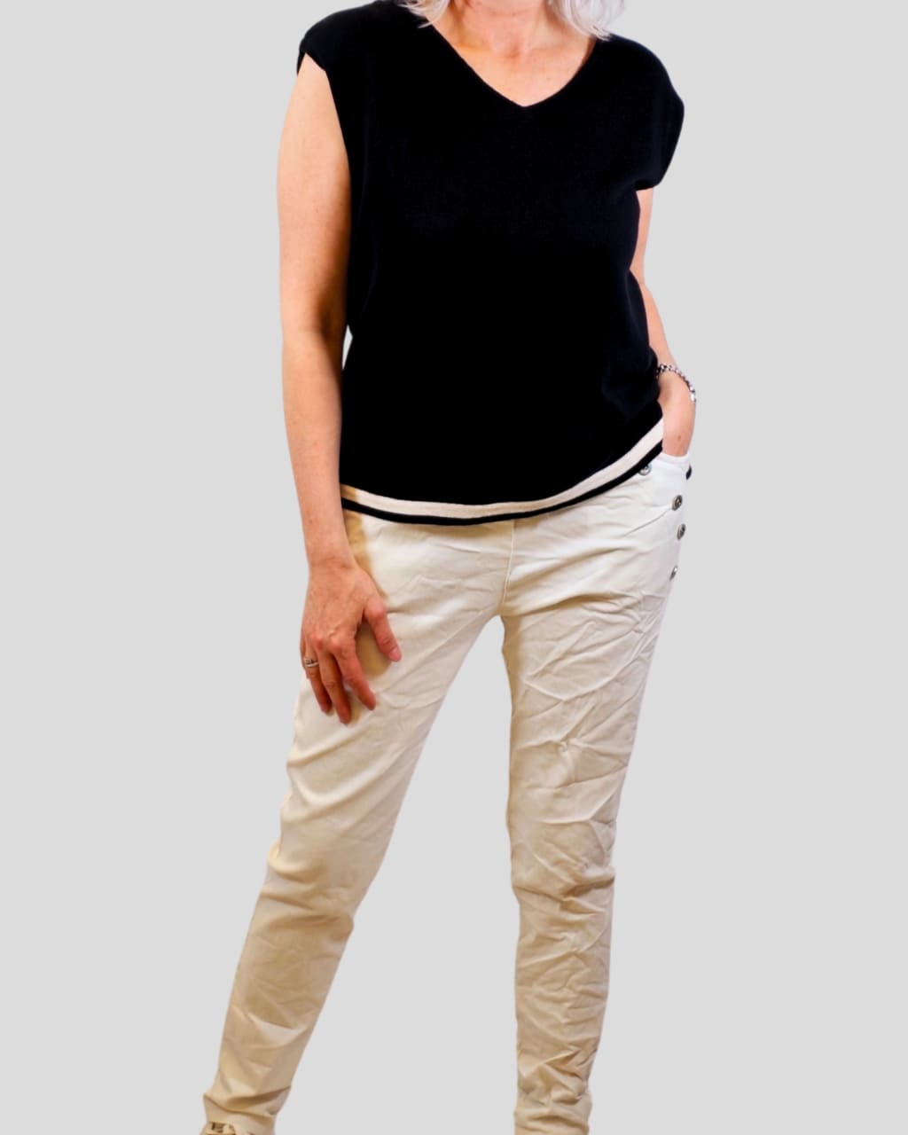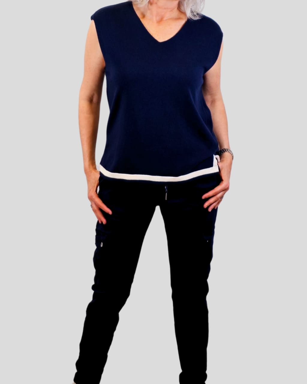 Jersey sin mangas con raya en bajos, en color azul marino y negro. Composición: 50% Algodón, 50% Acrílico.