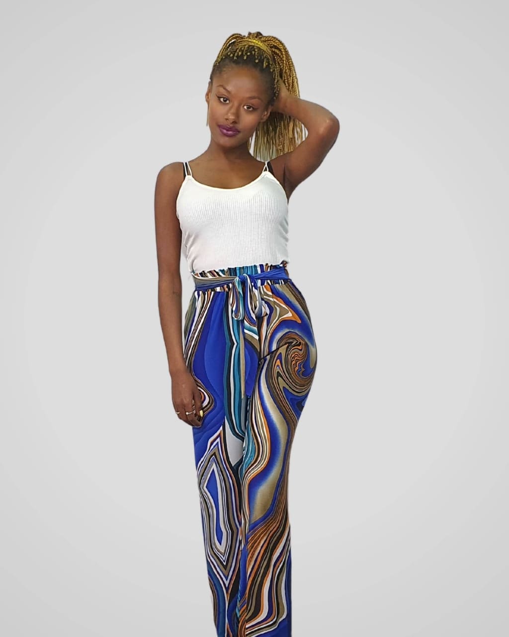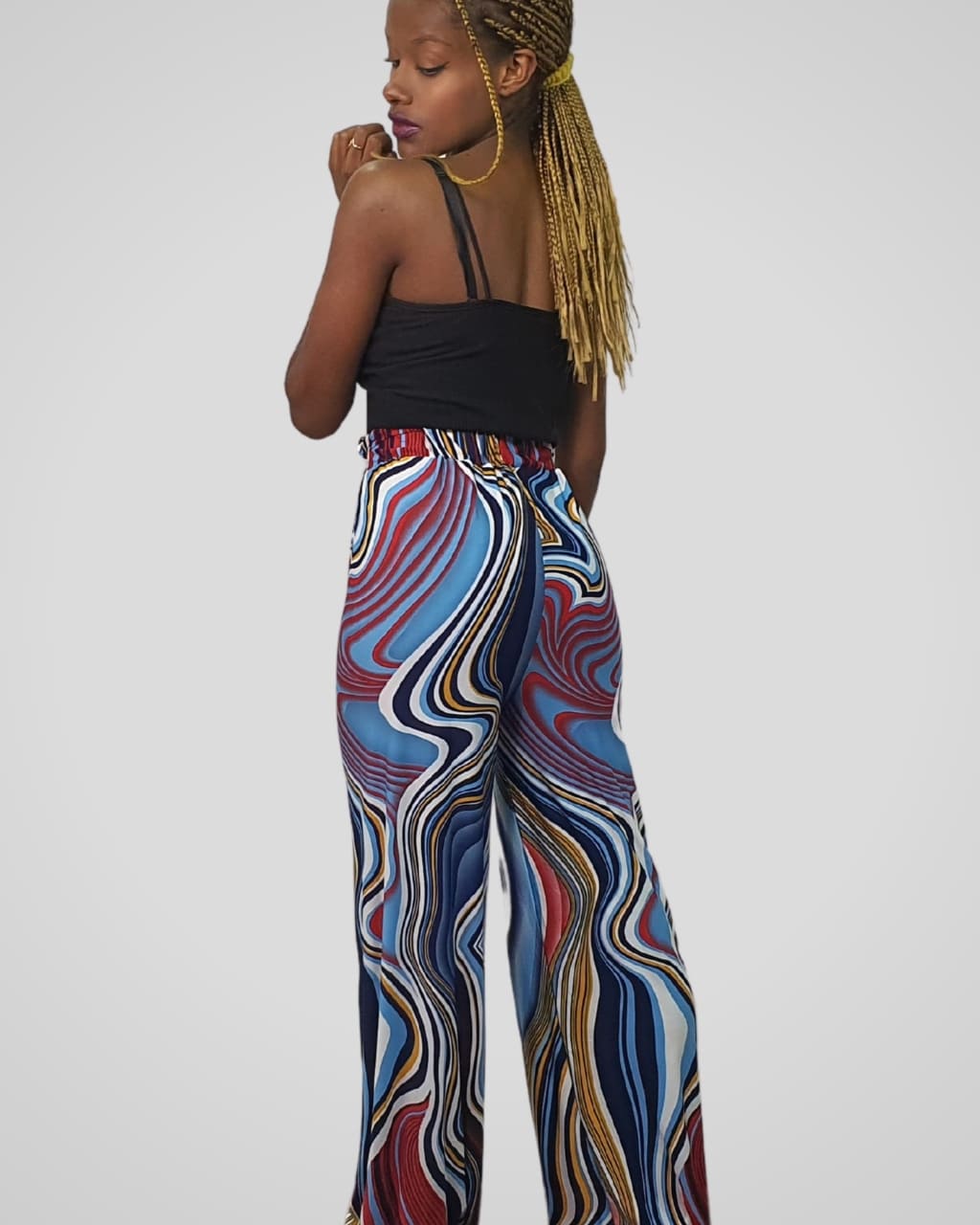 Pantalón ancho estampado de tiro alto, con lazo en cintura, de color azul, rojo y verde. Composición: 100 % Poliéster.