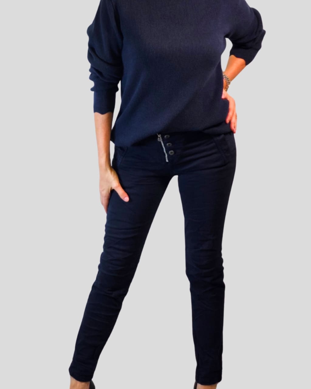 Descubre la comodidad redefinida con nuestro pantalón arrugado cremallera y botones, el básico que no puede faltar en tu fondo de armario. Este modelo de tiro medio ofrece un ajuste clásico y confortable, ideal para cualquier tipo de silueta. El sutil efecto arrugado le confiere una textura moderna y un aire casual que lo diferencia de un chino tradicional, siendo perfecto para un ambiente de trabajo relajado o para tus actividades de ocio.