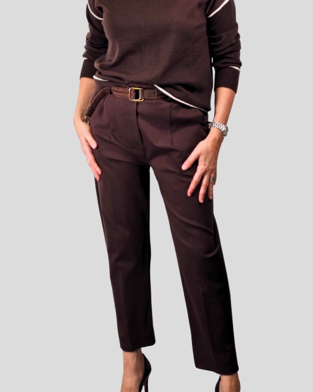 Diseñamos la prenda pensando en la practicidad: la goma en la cintura asegura un ajuste cómodo, y el cinturón incorporado añade un toque elegante. Lo encuentras en los ricos tonos violeta y marrón chocolate.