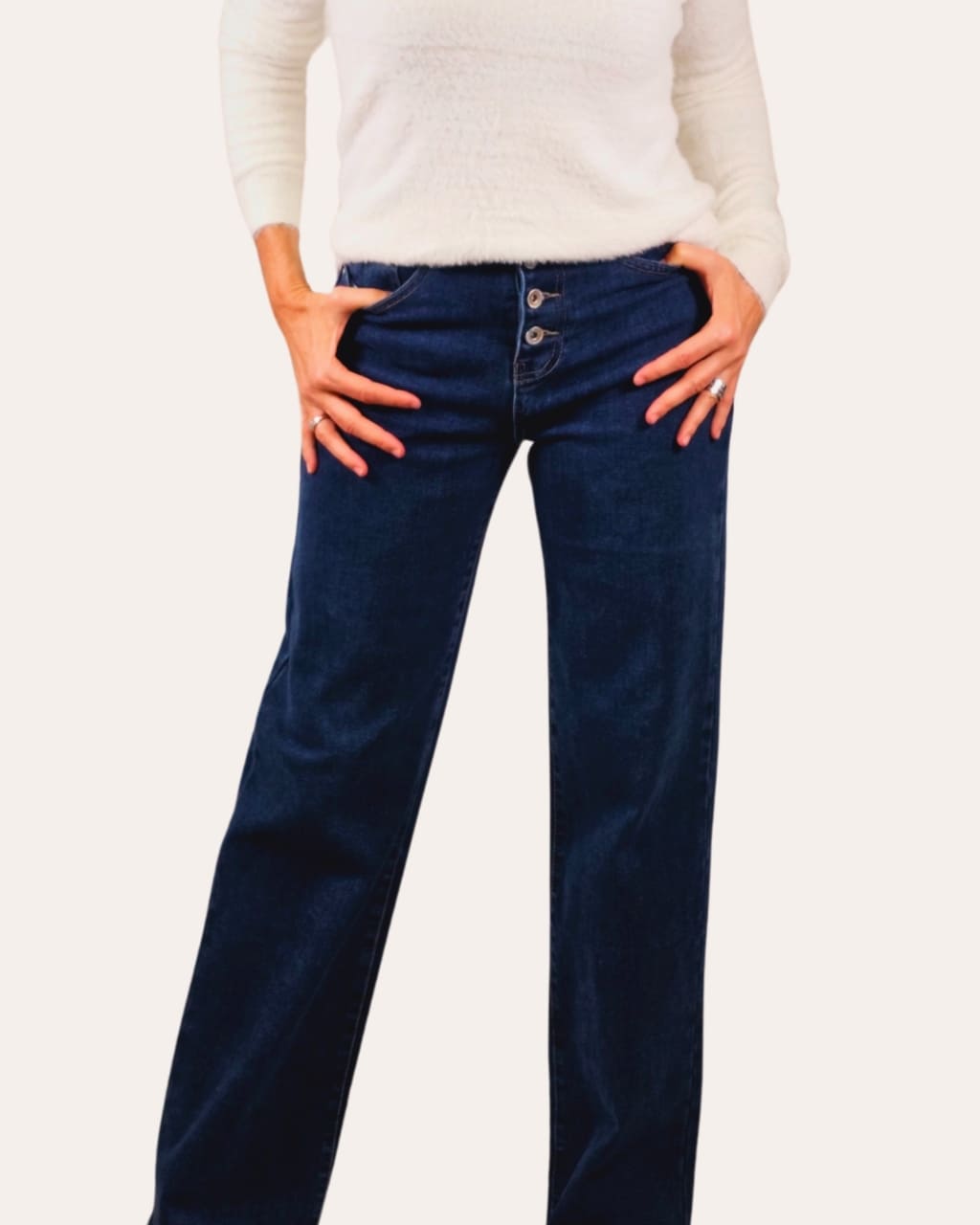 Este tejano pierna ancha botones es la pieza que necesitas para construir un look moderno con un toque retro. Su diseño de tiro alto acentúa la cintura y su corte wide leg (pierna ancha) ofrece una comodidad y un movimiento sin igual. Los botones a la vista en la parte frontal aportan un detalle diferenciador y muy actual al denim oscuro.