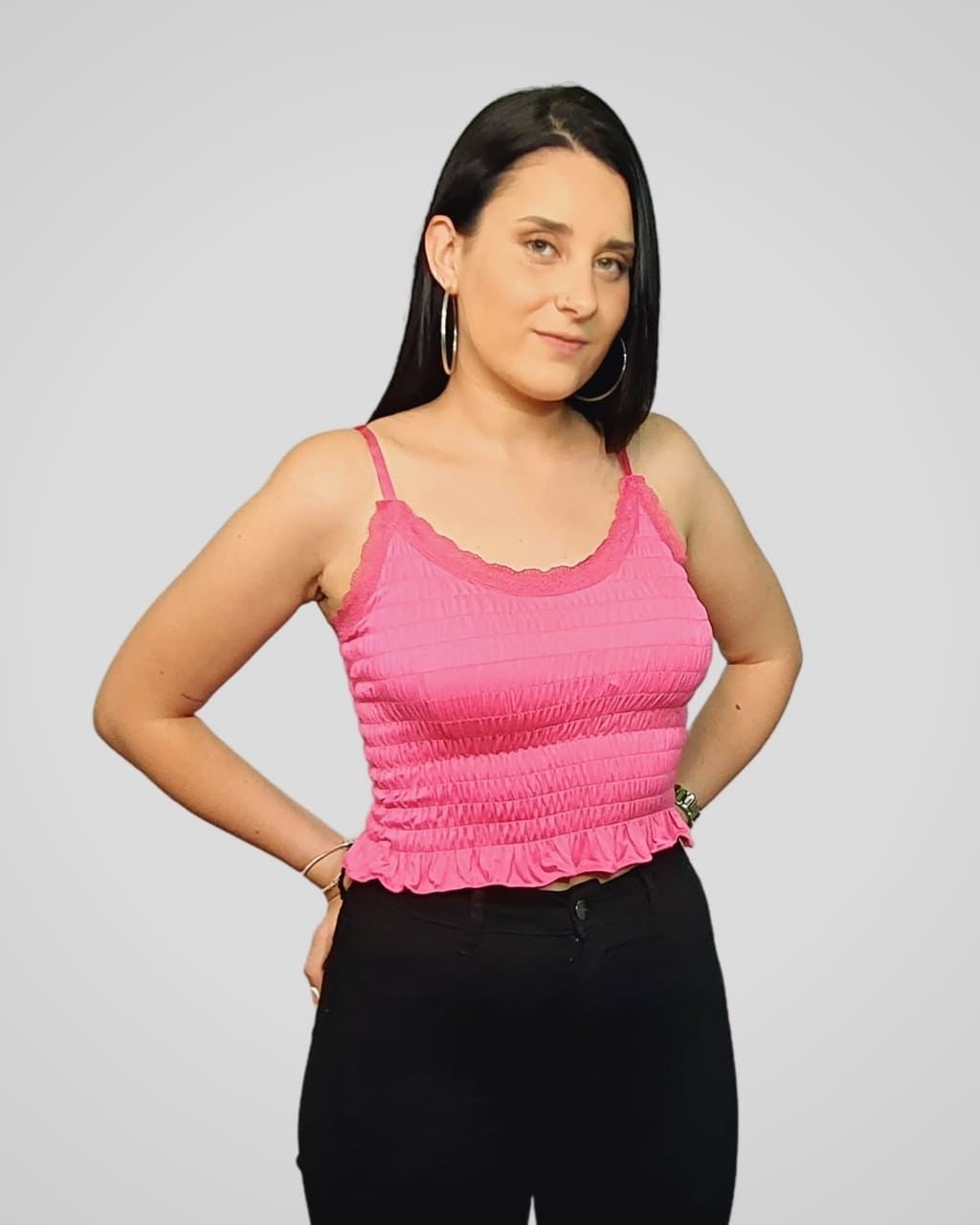 El Top puntilla nido abeja es la pieza perfecta para añadir un toque de romanticismo y detalle a tu look. Su diseño corto y ajustado se complementa con una delicada puntilla que bordea el escote, aportando un acabado sutil y femenino.